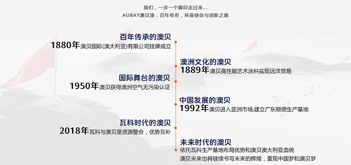 百年澳貝,見證了歷史的變遷,依托瓦科生產基地布局優(yōu)勢和澳貝澳大利亞血統(tǒng),澳貝未來也將繼續(xù)書寫未來的輝煌。圍繞“實業(yè)報國,實干興邦”方針,重現(xiàn)中國夢和澳貝夢。以推動中國涂料裝飾行業(yè)走向環(huán)保為己任,長期堅持以傳承工匠精神,不斷創(chuàng)新產品,改善工藝,以藝術涂料文化為靈魂,打造一流的產品和服務為企業(yè)使命。未來三年澳貝將在長江以南布局5大銷售公司,借力新型媒體的興起,助力品牌線上線下傳播,致力將澳貝打造成家家戶戶都用得起的藝術涂料。在機遇與挑戰(zhàn)并存的道路上,未來時代的澳貝通過革新與破局的思維,為員工、消費者、股東、社會創(chuàng)造更加美好的生活。